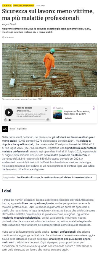 Ecco il link all'articolo del Giornale di Brescia: https://www.giornaledibrescia.it/cronaca/sicurezza-sul-lavoro-meno-vittime-ma-piu-malattie-professionali-s16nhoiu